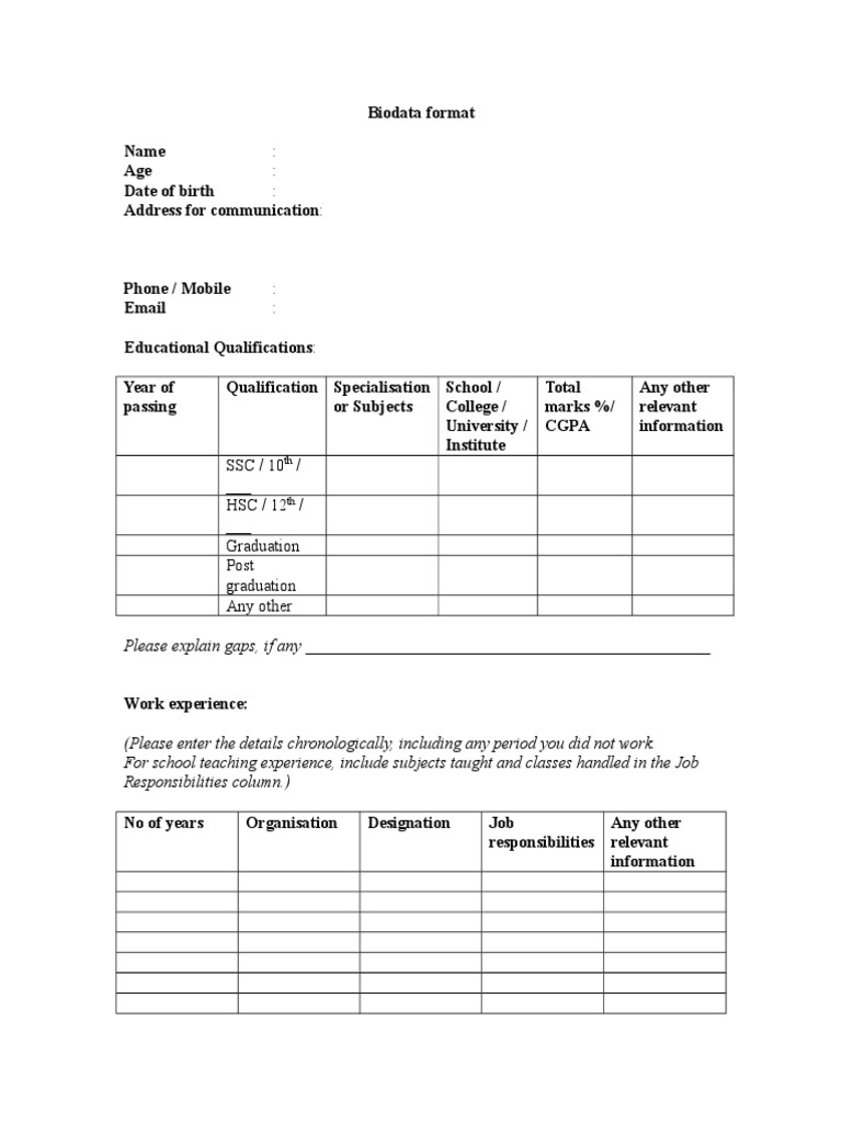 So, there are not any single kind of category. Post app lied fo r The employment biodata resume, or marriage biodata, acts as a personal profile for seeking a job or a prospective marriage partner, respectively. Bio data format always change as per job requirement or the very post requirement. When most people think of online bios, they probably can readily name a few common short bio examples first. Job interviews prepare for any interview and ace it. Of course, you are supposed modify and fill it in with original and correct information when creating your own version. Some of bio data sample. Generally it is single page format. Biodata is an abbreviation for the term biographical data. Career advice improve your career with expert tips. In the form, the user will be required to state his name in capital letters which will then be followed by his date of birth, nationality, religion, and. Name of the executive :